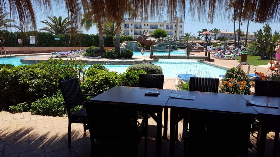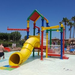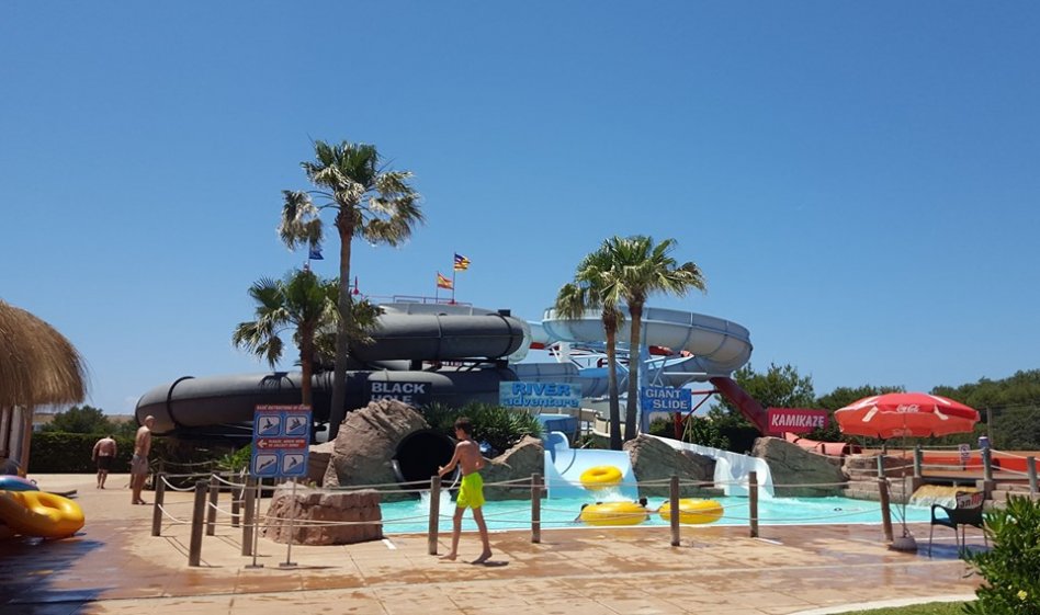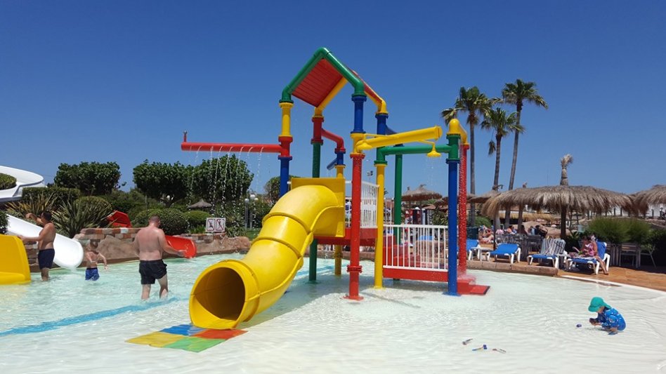 Water slides and pools for big and small with mature planted grounds and grassed